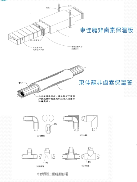 - 使用範圍方便廣泛且省工省料-質輕富彈性,可任意彎曲、伸長。施工時,只須在接合面使用黏劑即可,不須另外加披護或鋁箔,在凡而三通之處或冷風施工,使用東佳龍保溫材料,減少廢料產生。